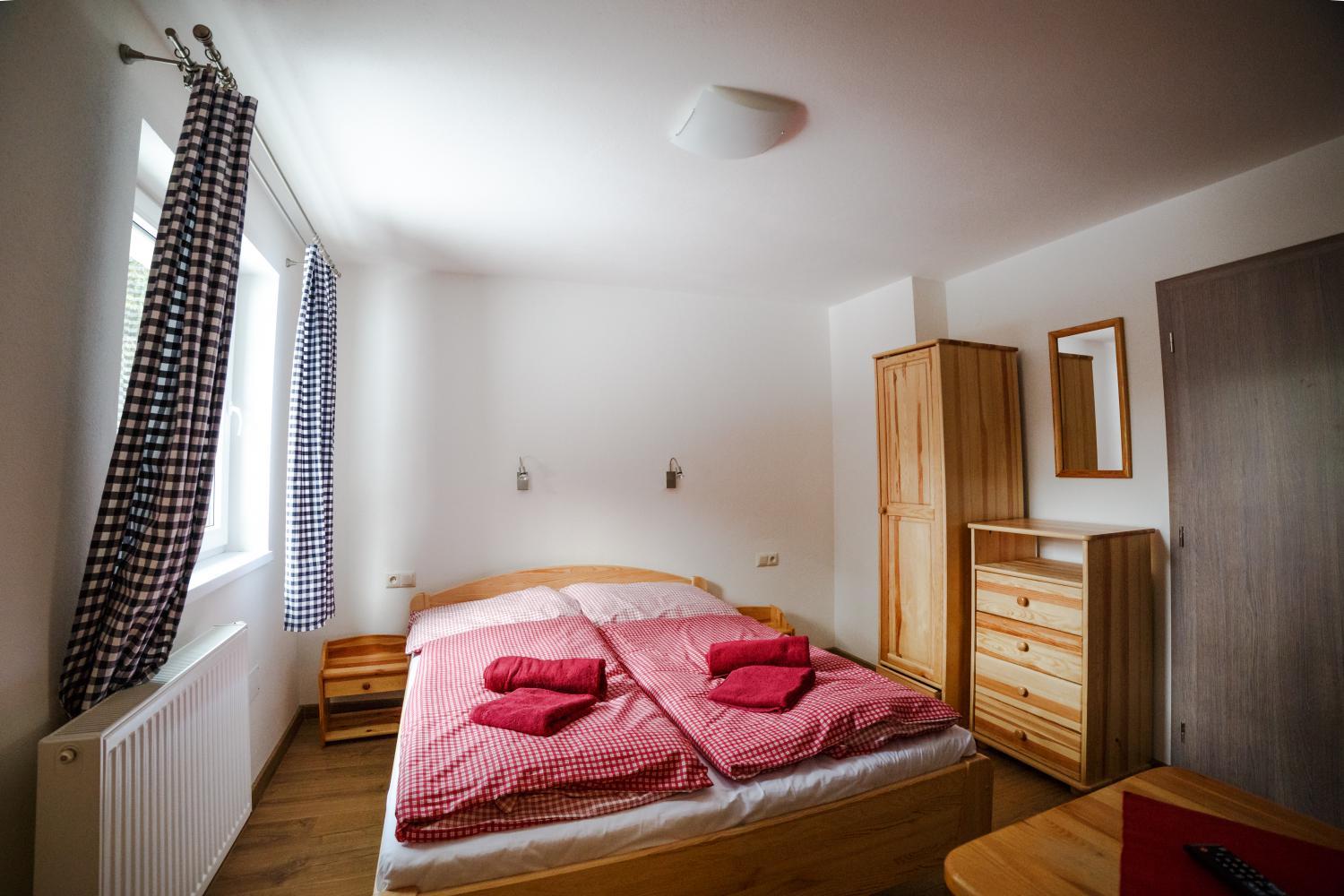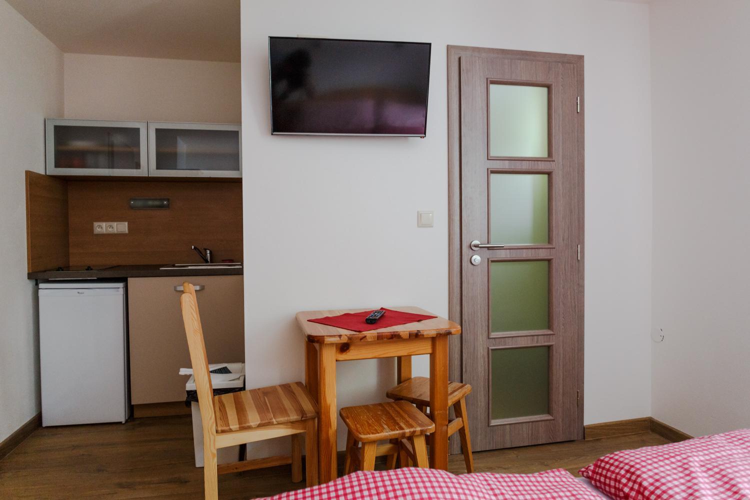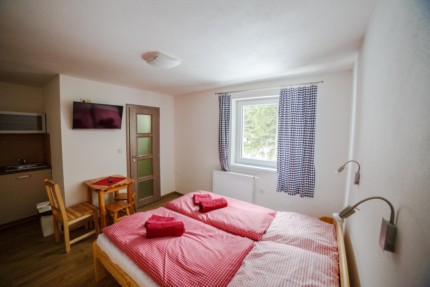 Dvojlôžkové štúdio sa od štandardnej dvojlôžkovej izby líši plne vybavenou kuchyňou. Vybavili sme ho pre vás nábytkom z masívneho dreva. Ponúka orientáciu na západ s výhľadom na zjazdovku, samostatnú kúpeľňu so sprchou a wc.